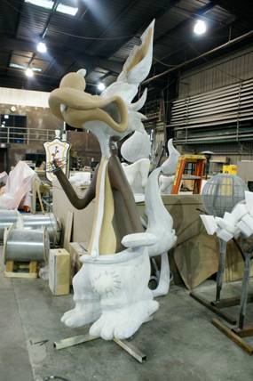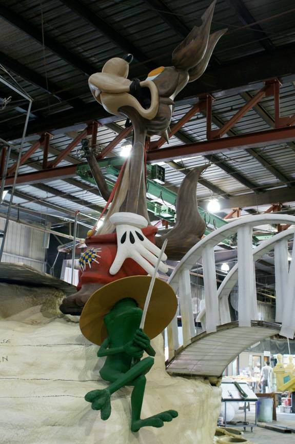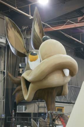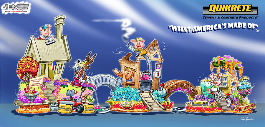Our float, designed by John Ramirez, is a fun play off the story of the little three pigs. As the fairy tale goes the three little pigs build their homes with the intention of keeping out the Big Bad Wolf. The first little pig builds his house out of straw, the second little pig builds his house out of sticks and the Big Bad Wolf blows both houses down. The third little pig builds his house out of QUIKRETE® Concrete Mix and thus out-smarts the Big Bad Wolf. His dream home is safe thanks to QUIKRETE®.